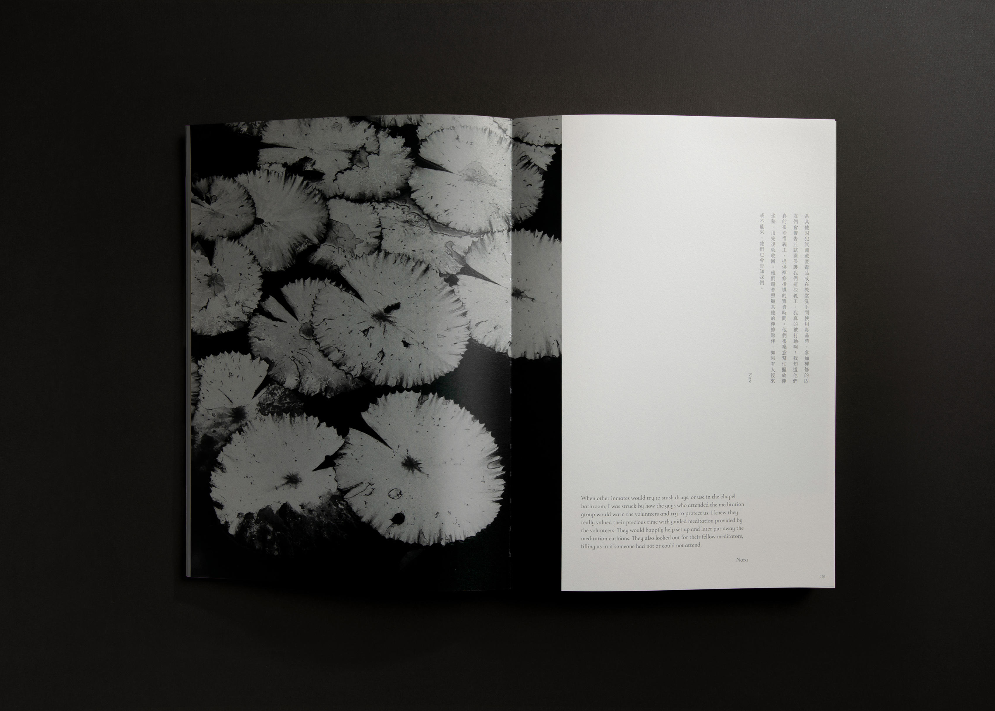 The cover features a design with a perforated tree canopy, revealing a sky that symbolizes hope and the serenity and joy of Buddha’s enlightenment under the Bodhi tree. Signifying the gradual liberation from the pains of incarceration. The book showcases the master’s photography, deeply reflecting the inmates‘ transformations under Buddhist teachings, illustrating their emergence from darkness into light.As the pages turn, the book’s background shifts from deep darkness to soft, light hues, symbolizing the inmates‘ spiritual metamorphosis and rebirth. Each photograph’s theme evolves, transitioning from initial gloomy scenes to later images filled with brightness and hope, portraying their struggles and growth guided by the Dharma. This shift in color and theme allows readers to feel the power of hope, as if each page recounts the journey from despair to illumination.