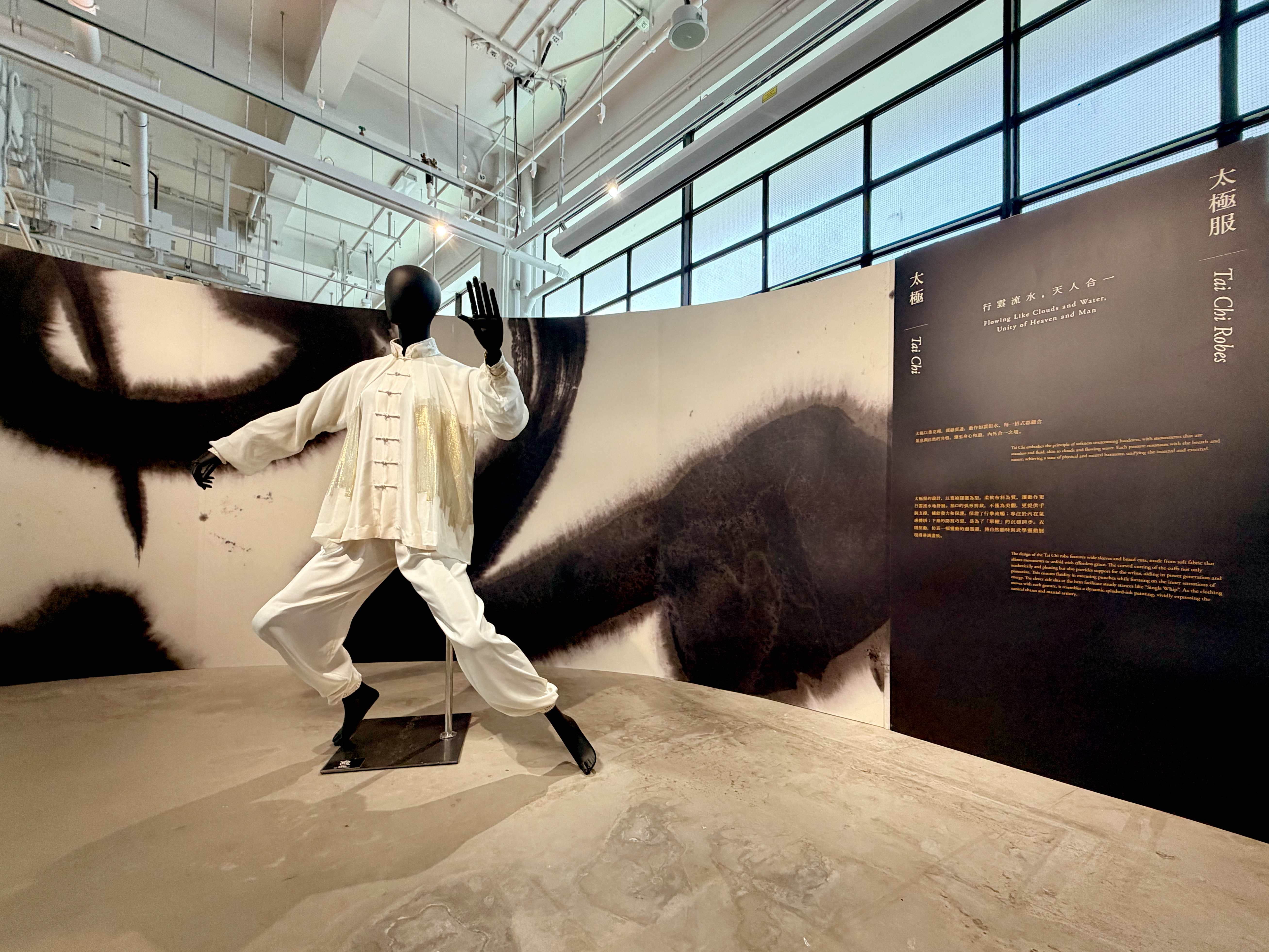 The venue features two large screens at its center: one displaying martial arts movements, the other showcasing the intricate details of traditional attire. Standing between them, visitors can observe how clothing interacts with the rhythm and flow of martial arts. We have also invited calligrapher Packy Lai to capture the circular grace of Tai Chi and the dynamic speed of nunchaku through brush and ink, transforming the beauty of martial movement into artistic expression on paper. In the Wing Chun section, fabric strips are hung on the wooden dummy, mimicking the trajectories of strikes—simple yet deeply evocative.